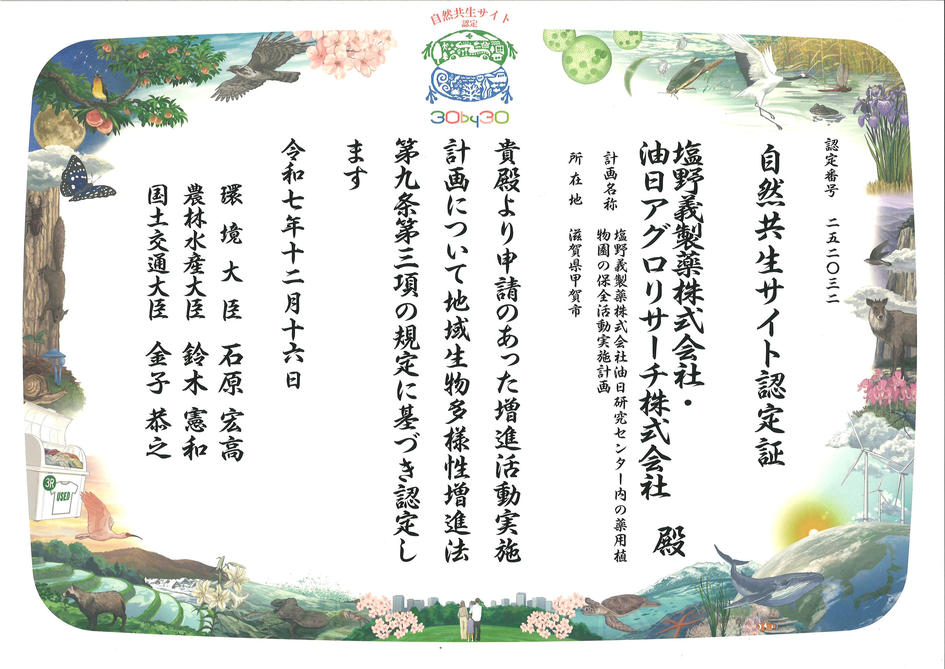 塩野義製薬株式会社(本社:大阪府大阪市、以下「塩野義製薬」)およびSHIONOGIグループの油日アグロリサーチ株式会社(本社:滋賀県甲賀市)は、塩野義製薬の油日研究センター内にある薬用植物園(以下「油日植物園1」)が、環境省によって「自然共生サイト2」に認定されたことをお知らせいたします。